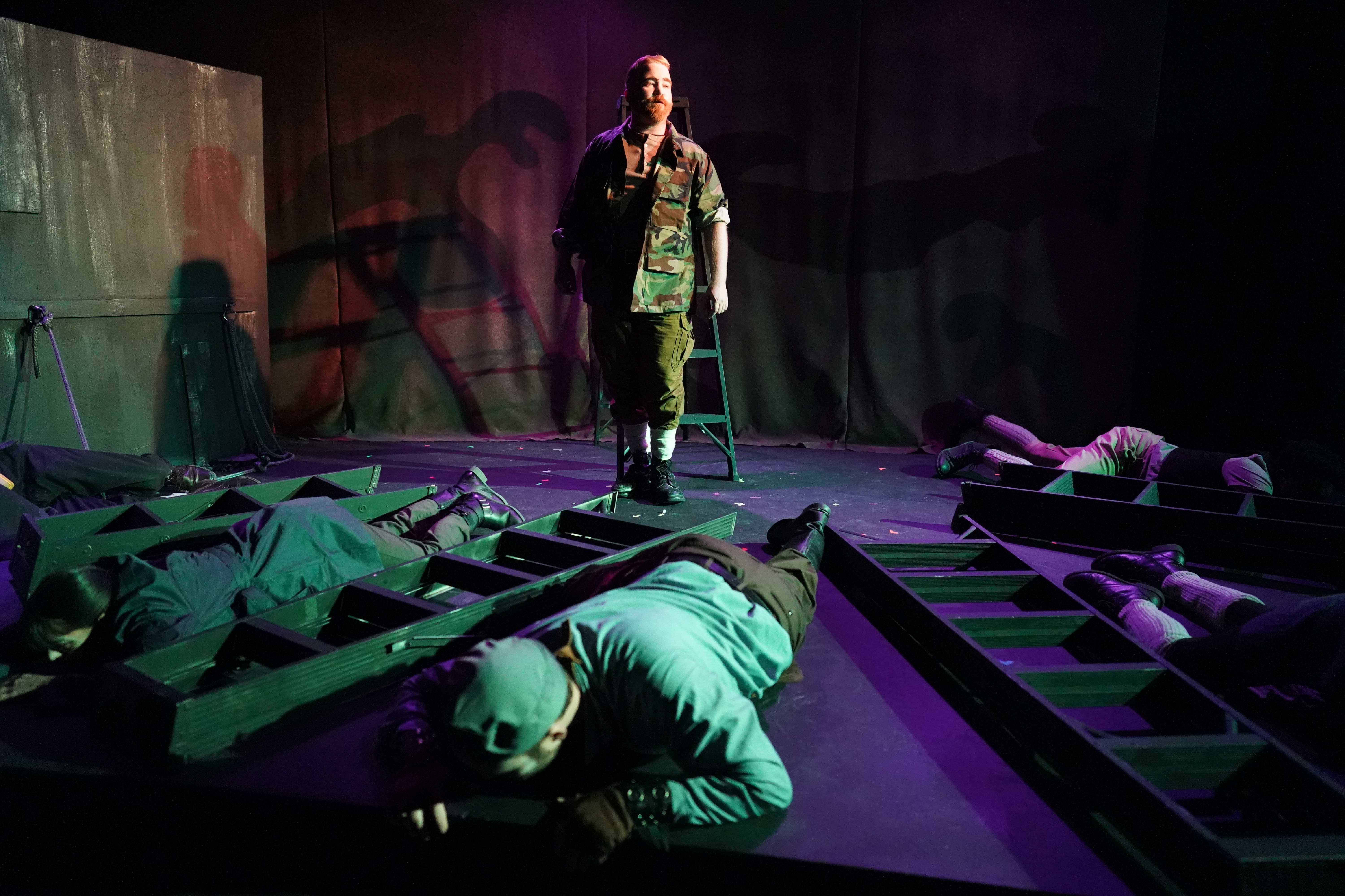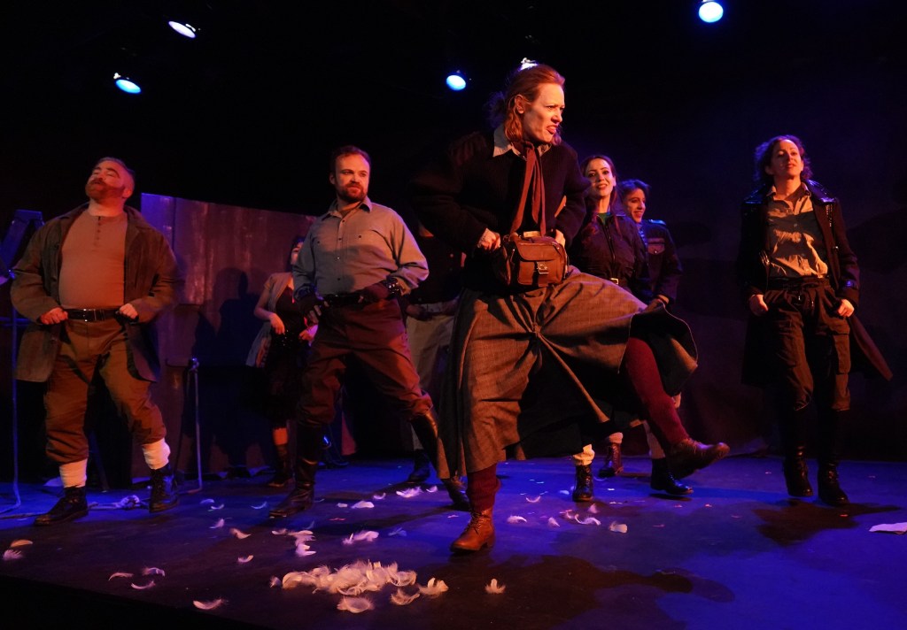 All meshed wonderfully in the choreographed movement and song that characterize Truax’s productions. He told me that he came to theater through painting and dance and that he sees ensemble acting as painting with bodies. The only other set pieces were step ladders of various sizes used to establish both different levels of power and status. Crude wooden guns served multiple functions including as bottles of liquor. I don’t know if Mao’s dictum about power (and all that goes with it) growing from the barrel of a gun was in the director’s mind but it was in mine as I watched. The drawing of lots in the first scene was managed with cardboard (black cross!) and paper (blank) so the crosses could be felt but not seen as they were drawn.