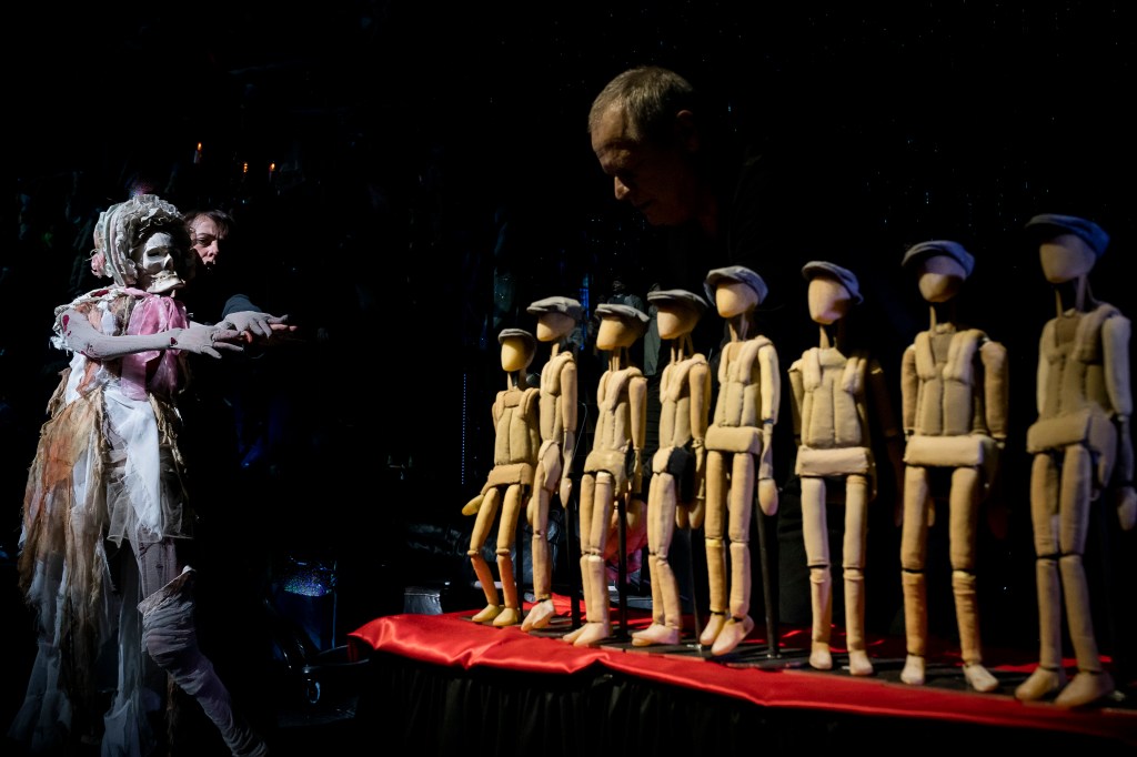 At the beginning of the performance, the puppets from Suse Wächter’s collection, depicting influential figures of the 20th century, are already hanging on the front stage. Suspended from the hooks of a large black box at various levels, their limbs dangle limp and lifeless. But this soon changes as the lights in the auditorium go out and the three puppeteers for the evening take the stage, accompanied by musician Trippner. Over the course of the performance, Trippner skillfully, humorously, and with gestic expression plays a variety of instruments, significantly shaping the evening’s tone alongside the second musician, Klingeberg.