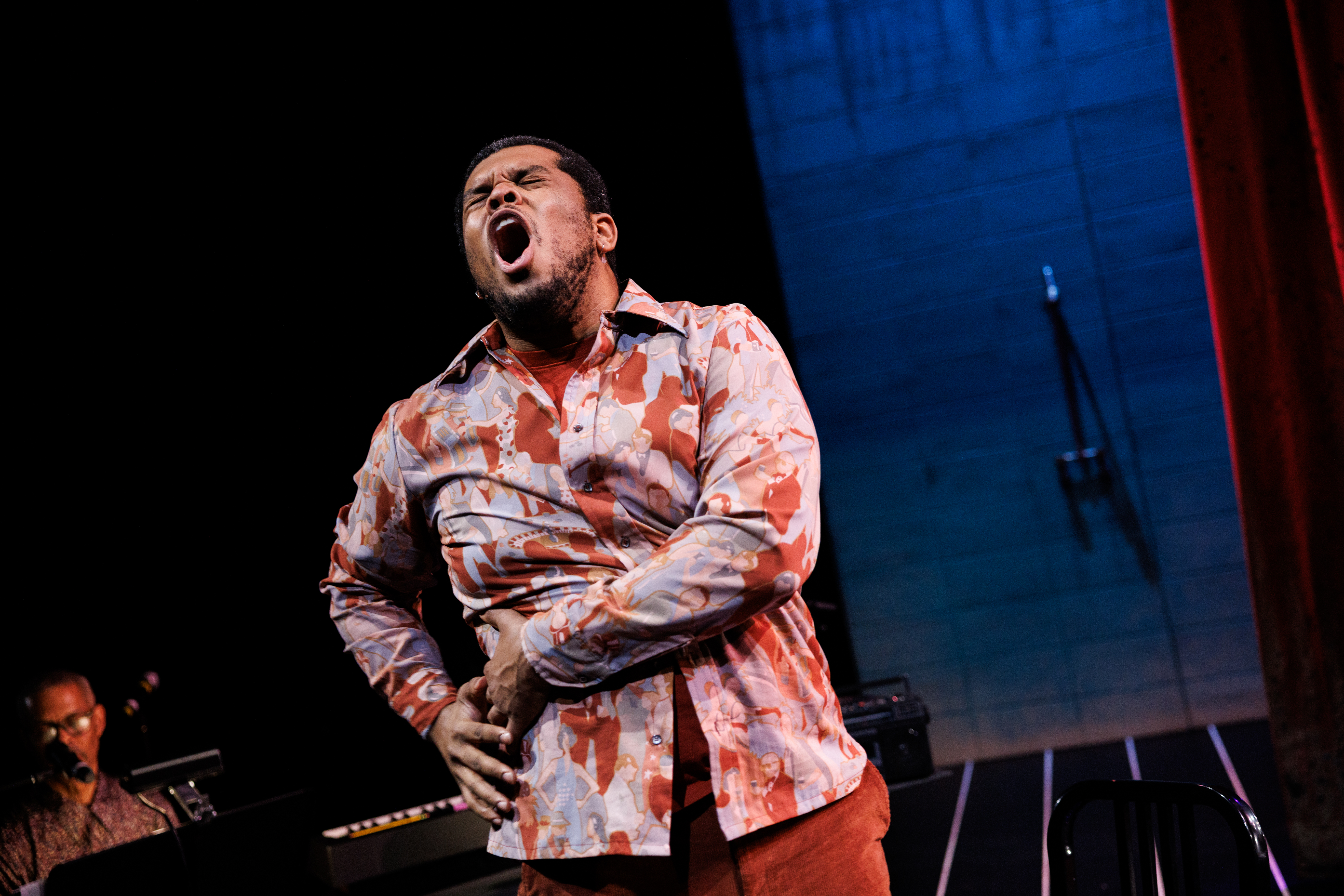 The brillance of the piece was further heightened by the music. The songs were composed by the multi-talented Mustapha Khan, a two-time Emmy Award-winning filmmaker, with help from Beber, the cast, and the musicians William Kenneth Vaughan and Norman “Skip” Burns. Aesthetically, the music displayed great variety and range, moving from disco to Latin beat, to Black liberation undertones, to honky-tonk campfire. The latter was clearly one of the crowd favorites. In this song, a guitar is hurriedly shoved into the hands of Zane Pais (who, as a running gag, has trouble keeping up with who he’s supposed to be playing). He’s then told he’s now somehow supposed to be playing Brecht himself. After a brief moment of panic, he’s ready to start strumming as soon as the first ray of the spotlight hits him. Besides just being great fun, the song, “Let’s Make Strange,” also served as a pithy little lesson on Brecht’s aesthetics.