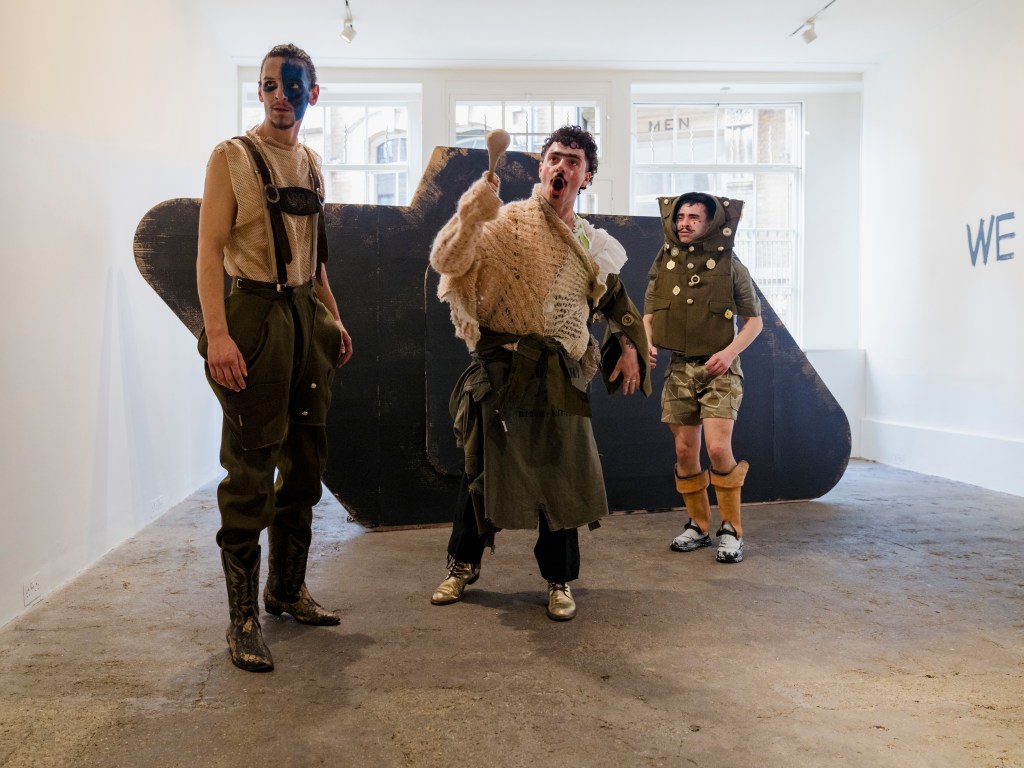 PvH: Yes, the window to the street offered enormous vibrancy as it confronted the dramatic and historical material with an ongoing reality check, opening up the exhibition to the indeterminacy of real life and our political moment now. Not only did the audience look out onto the street, passers-by looked back in onto them, and sometimes indeed attempted to walk in. In the evenings, audiences would often see Deliveroo cyclists passing by, creating an immediate concrete connection to the economically disenfranchised ‘Unemployed People’ as key protagonists of The Breadshop, who we had already equipped with cardboard delivery backpacks in order to situate them in the context of today’s gig economy. Of course, that analogy of unemployment during the Great Depression to working conditions in today’s economy is no more than an approximation, but in terms of the social relations and indeed the gestures produced by both historical contexts, it made absolute sense. It would be left up to the viewer to examine both the historical resonances as well as dissonances conjured up by this comparison.