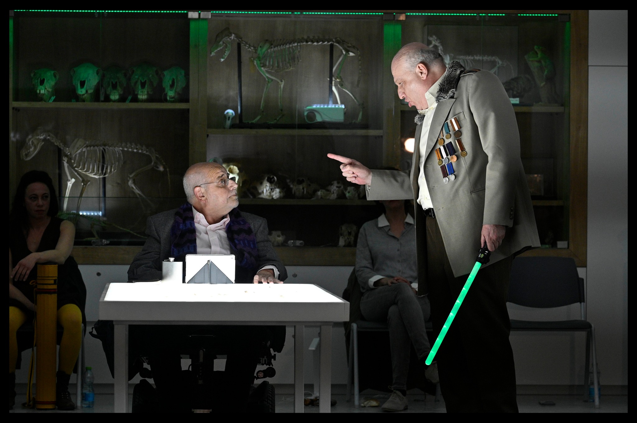 The third format used in Antigone [Brecht] is defined by a third type of performing space, to which the audience is led after an educational, and somewhat mocking, excursion through the museum’s exhibits. Thus, the spectators find themselves inside a long, rectangular room that functions as both a classroom and a lab. A laboratory atmosphere permeates the space, from the dazzling white cupboards along the lower walls and the animal skeletons in display windows above them, to the sinks with running water for emergency handwashing. The audience, numbering no more than fifty people, is seated around the perimeter of the classroom. The bright fluorescent lights (designed by Yaron Abulafia) are hardly ever dimmed; the main events of the play are presented in the center, and everyone is in full view. The director and stage designer are also in full view, sitting in the same row as the spectators. They observe the laboratory action they have created and its reception. Unlike the actors and spectators, their faces betray no emotions, which strengthens the tension, arouses curiosity, and makes their presence part of the overall, provocative performance.