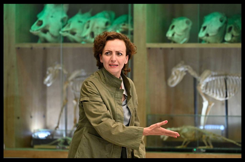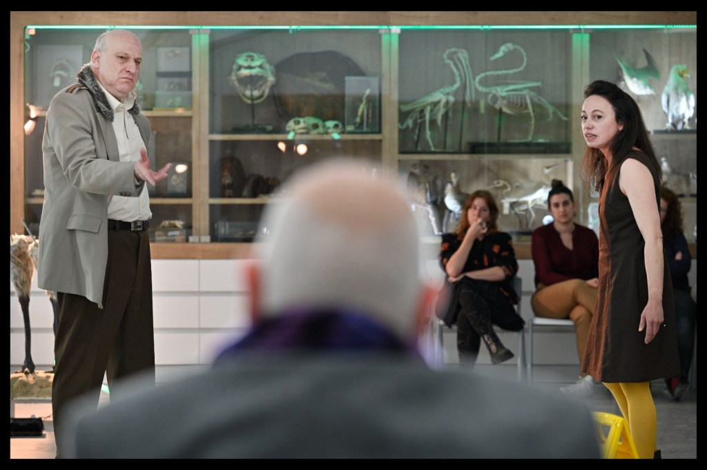 Indeed, everything suddenly goes into motion. The audience is invited to follow Antigone into the museum’s exhibition halls, looking at the exhibits as they listen to the museum’s audio tour on headphones which they received upon entering the space. The calm measured narration of the guide – a stylized introduction to the exhibition that tells the story of nature – is periodically interrupted by the nervous, panting sounds of Antigone, recounting the horrors of war. This creates two parallel and colliding soundtracks: one of natural history and one of personal catastrophe. Avneri clarifies that “the play’s soundtrack juxtaposes the institutional-patriotic narrative of the museum with the narrative of Antigone. The museum’s audio tour stresses that the corpses of dead animals are ‘state property’ that individuals may not collect without permission. In contrast, Antigone’s narrative stresses that corpses are not ‘state property’ and that an individual must act on their own accord when authorities are tyrannical”. It’s also worth noting a hidden detail. The audio guide’s voice, narrating the natural history, belongs to the highly respected retired theater critic Michael Handelzalts, who will later perform as one of the actors in this performance. Only a small part of the audience can identify it, but the actors’ awareness of the voice creates an inner energy that resonates throughout the entire play.