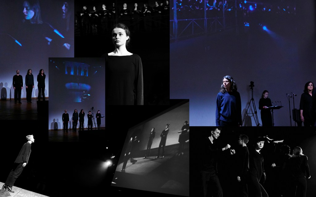 Eine Zeitlang probte ich von Berlin, eine Zeitlang von Moskau aus mit den SchauspielerInnen in beiden Ländern und dem Moskauer Gebärdenchor. Dann konnten wir live und gleichzeitig in zwei Ländern die Stimmen der Maßnahme dem Kaleidoskop von Stimmen der russischen Revolutionszeit aus Pfad des Oktober gegenüberstellen: 12 jungen KomponistInnen von „Prokoll“ – einer Abbreviatur von „Produktions-Kollektiv“ – und 12 DichterInnen aus den Jahren zwischen 1905 und 1924, die mit diesem Stück einen neuen, explizit nicht-christlichen Kanon begründen wollten.