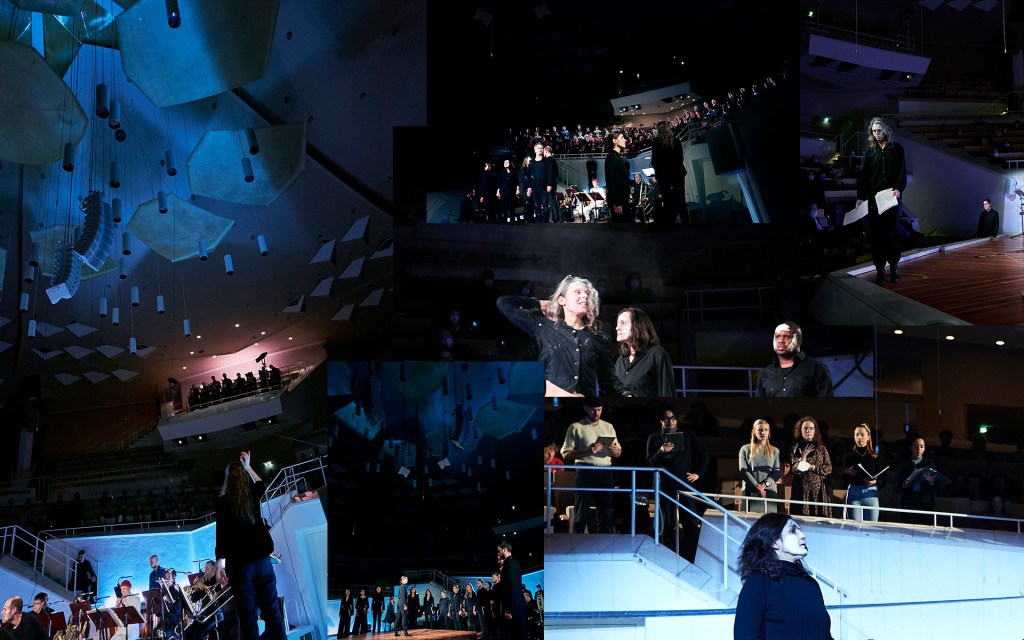 Es erfüllt mich aber nicht mit Jubel, sondern es hat mir das Herz angebrochen. Jetzt erscheint das in einem anderen Licht. Nicht nur, dass die Bedingungen, unter denen unsere Arbeit sich seit März 2020 entwickelte, mehr als hart waren, die Chorlandschaft in unheimlicher Stille lag. Wir wissen, dass Menschen alleine gestorben sind. Dagegen scheint es klein, dass auch die älteste Strategie der Menschheit zur Krisenbewältigung kaum ging, das gemeinsame Singen. In einem anderen Licht erscheinen nicht nur die Verwüstungen und Hindernisse, die gerade für so eine Chorarbeit im Hintergrund mitliefen, dass wir ganze Chöre verloren, dass in der deutsch-russischen Vorstellung sogar ein professioneller Berliner Chor noch nach der Generalprobe, eine halbe Stunde vor der Vorstellung in 2 Ländern mit 250 Mitwirkenden und 6 Förderern, plötzlich abhanden kam oder diese fieberhafte Arbeit, wertvolle SchauspielerInnen, SängerInnen, OrchestermusikerInnen, leitende Stellen in voller Fahrt auszuwechseln oder zu lassen, was nicht zu halten war, wie leider die Öffentlichkeitsarbeit (sodass sich bisher fast nur die Anwesenden in der nach Hygienevorschriften vollbesetzten Philharmonie darüber ausgetauscht haben). Die vollständige Ungewissheit, in der wir schwebten, bis zu dem Augenblick, in dem das Stimmengewirr der Zuschauer den Saal erfüllte, verklang und die Vorstellungen anliefen, erscheint jetzt in einem anderen Licht.